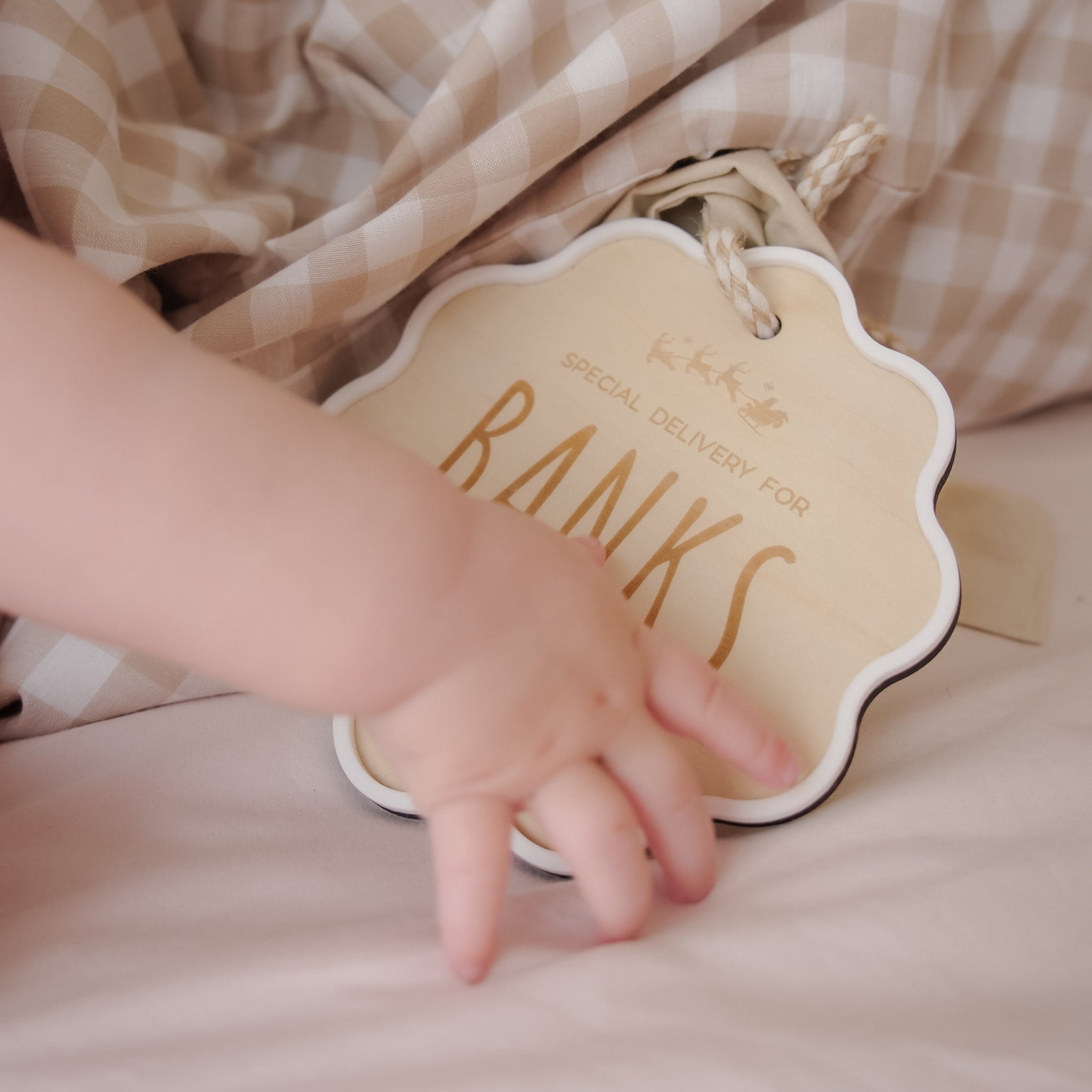 Made from beautifully layered wood and white acrylic, with an engraved special delivery message for your little ones in their name.