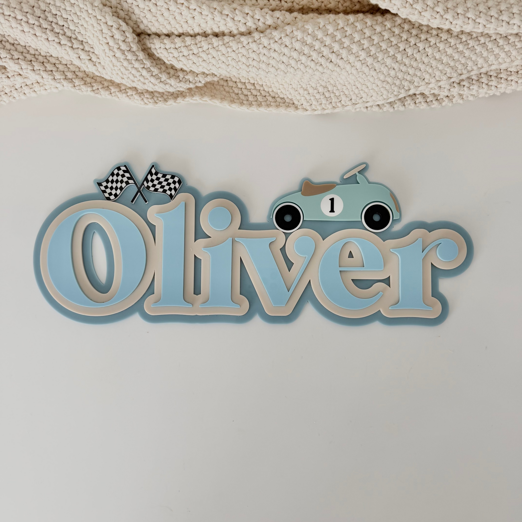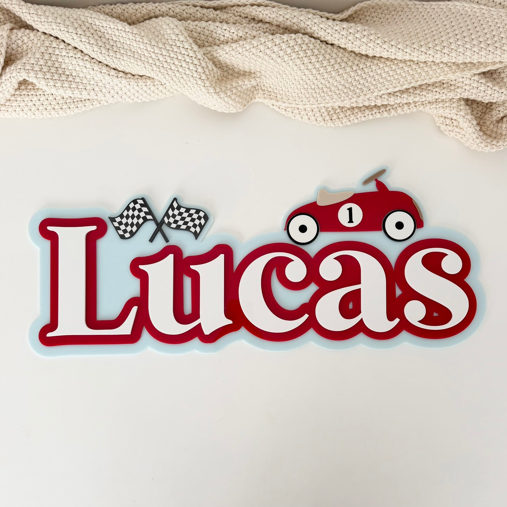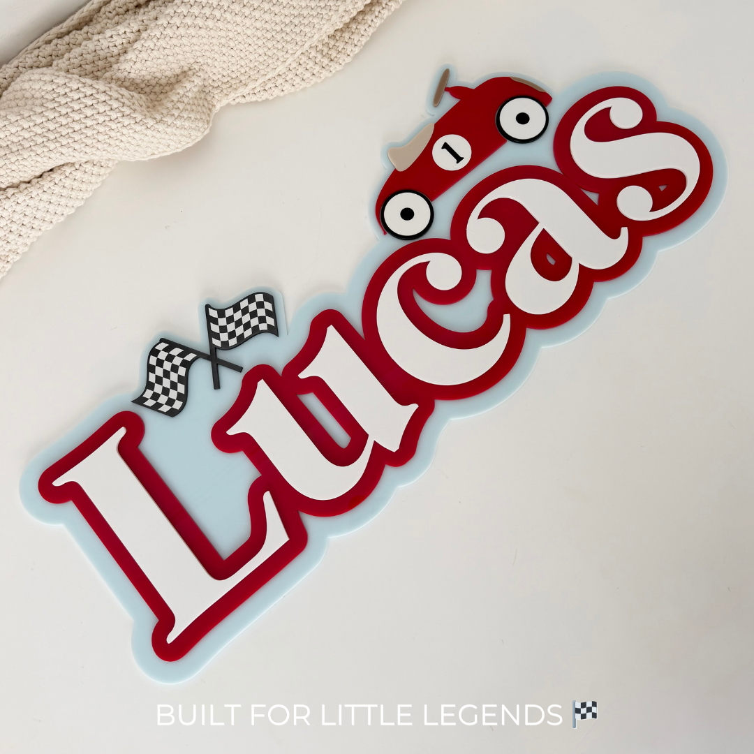 Crafted with three layered acrylic pieces, this design features a classic vintage car and check flag detail, bringing a fun, race-inspired feel to your child’s space.